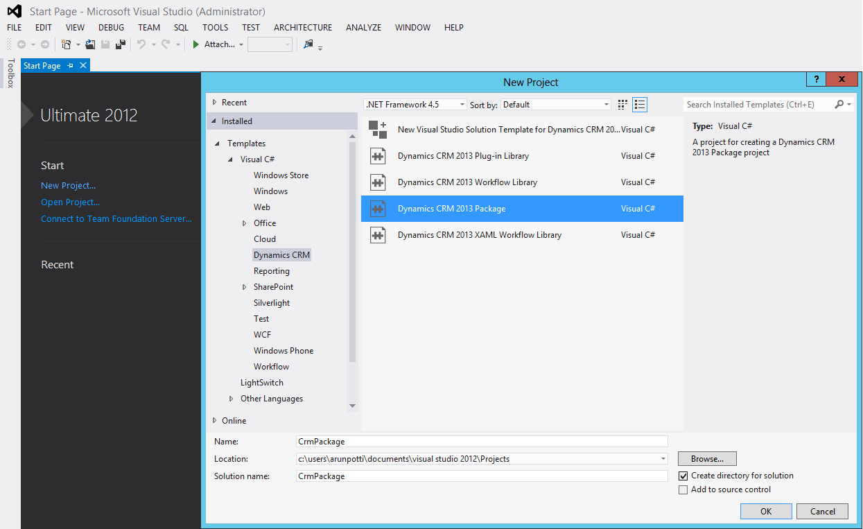 Step 1: Open Visual Studio 2012. ย Click on New Project. Goto Visual C# -> Dynamics CRM -> Dynamics CRM 2013 Package. Provide Name โCrmPackageโ.